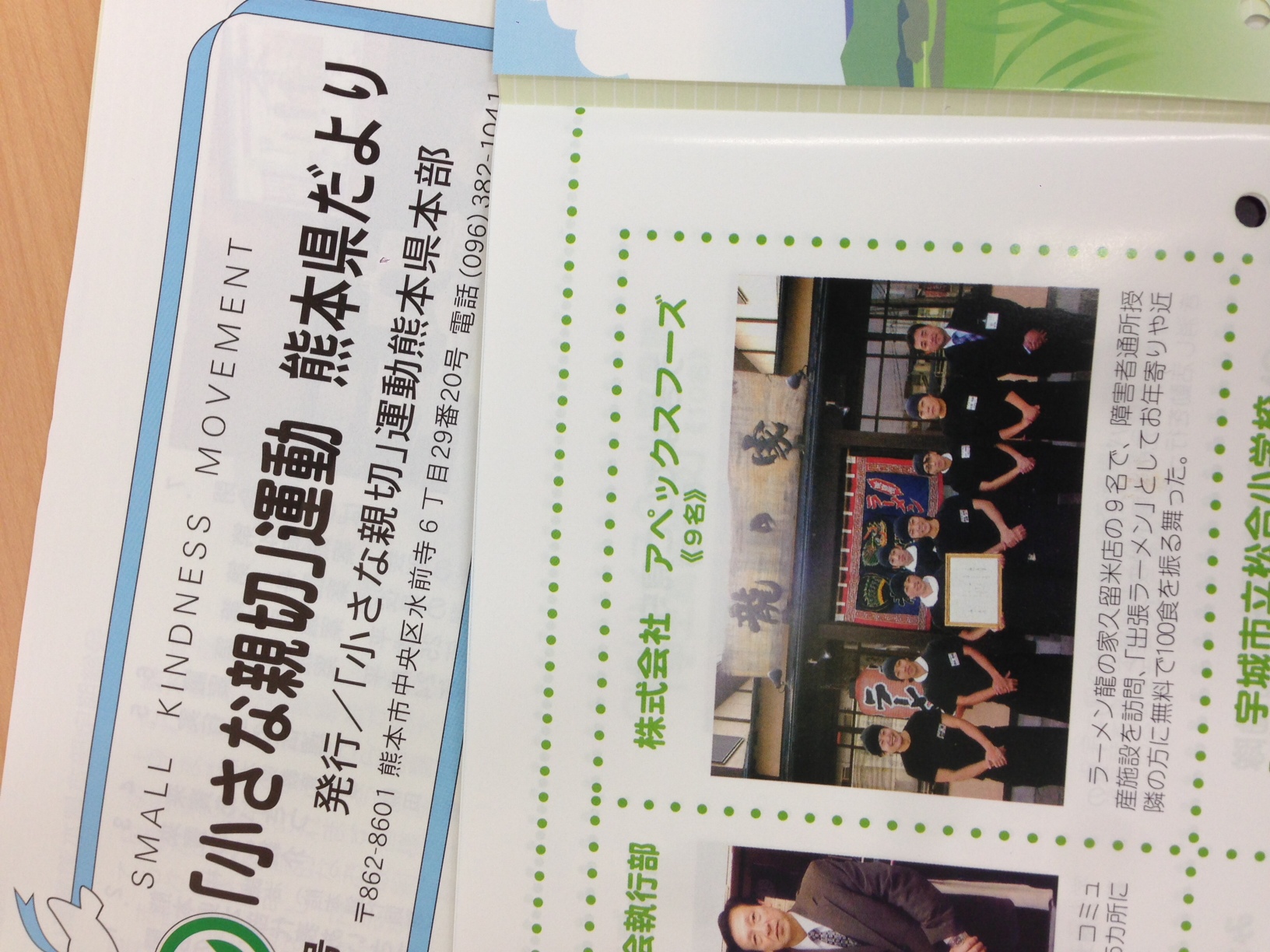 2013/8/5 新着情報・・・【久留米インター店】 久留米インター店の活動が、「小さな親切」運動 熊本県だより に掲載されました。 昨年の敬老の日に熊本県の通所授産施設を訪問し 「出張ラーメン」として龍の家のラーメンを100食振る舞わせて頂きました。 その時の活動が掲載されました。 ご協力頂いた皆様、ありがとうございました。